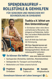 Tushia e.V. startet eine Spendenaktion zur Unterstützung älterer und behinderter Menschen in Simbabwe. Viele Betroffene sind dringend auf Rollstühle, Gehhilfen und andere Mobilitätshilfen angewiesen – doch es fehlt oft an Geld und Versorgung.